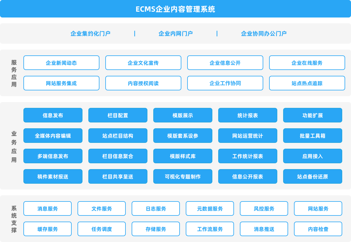 ECMS企業(yè)內(nèi)容管理系統(tǒng)是基于微服務(wù)架構(gòu)設(shè)計(jì),能夠滿(mǎn)足企業(yè)內(nèi)外網(wǎng)一體化門(mén)戶(hù)建設(shè)和內(nèi)容生產(chǎn)發(fā)布需求,提供全媒體數(shù)字內(nèi)容采集、編輯、多端發(fā)布、共享、呈送、糾錯(cuò)和歸檔等服務(wù),涵蓋信息內(nèi)容全生命周期過(guò)程中所需的各項(xiàng)功能,旨在幫助用戶(hù)解決日益復(fù)雜的門(mén)戶(hù)內(nèi)容創(chuàng)建、維護(hù)、發(fā)布和應(yīng)用的問(wèn)題。既適用于獨(dú)立的門(mén)戶(hù)創(chuàng)建,也支持橫向和縱向的企業(yè)門(mén)戶(hù)站群建設(shè)。